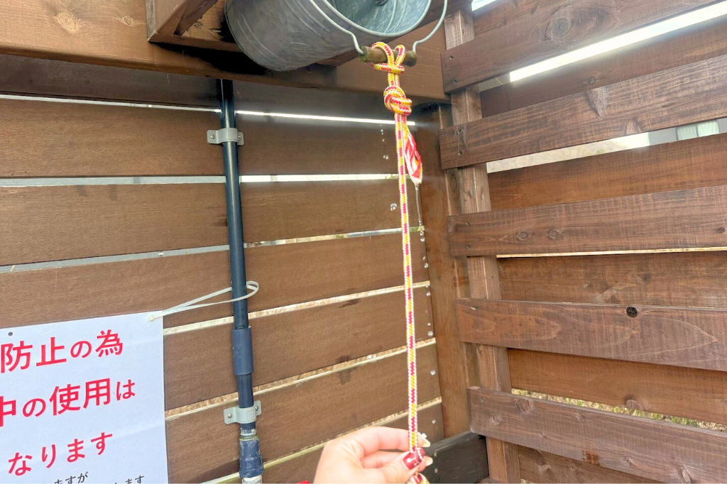 サウナで火照った身体は、外にあるバケツ水シャワーで一気にクールダウン。これが爽快で気持ちいい!